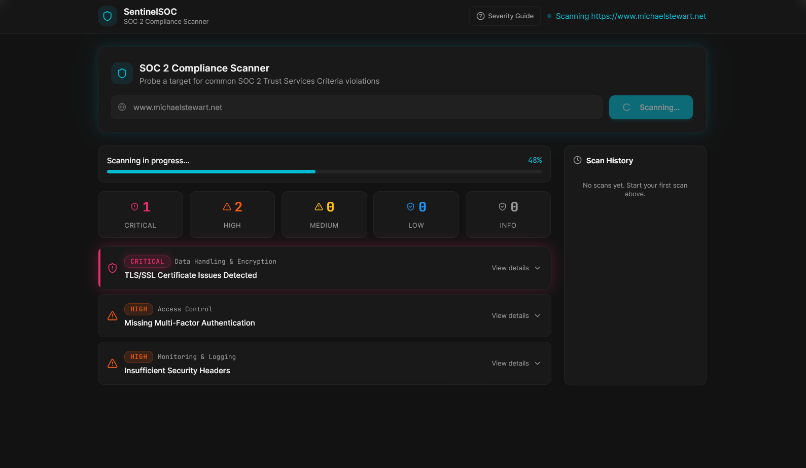 Below are some images of the SOC 2 scanning application I created using Loveable.