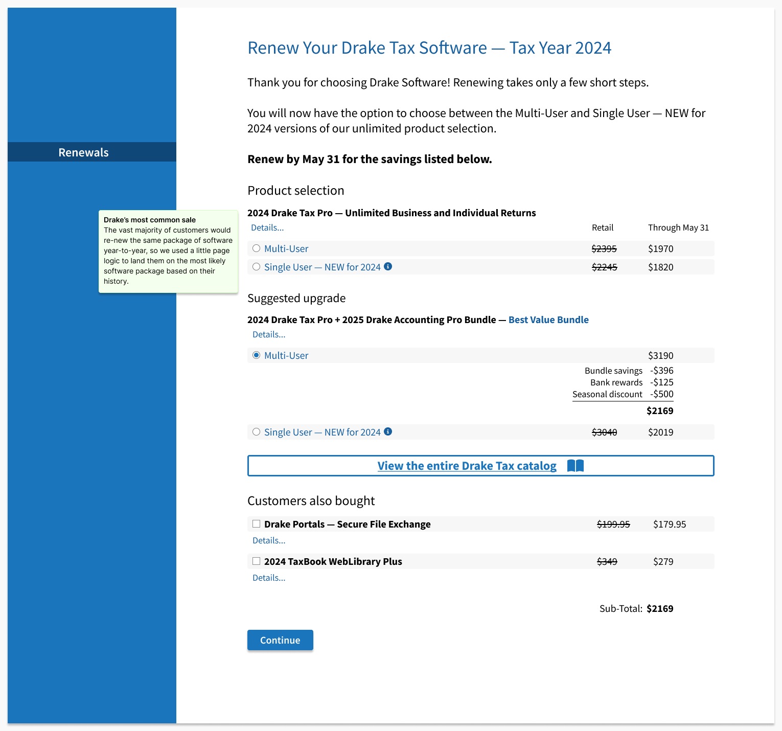 Drake Software offers existing users significant discounts for renewing their software immediately after the tax season ends.