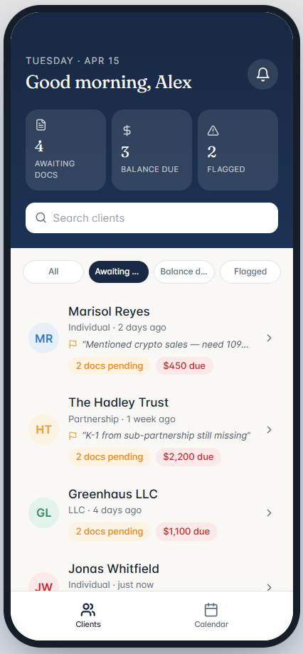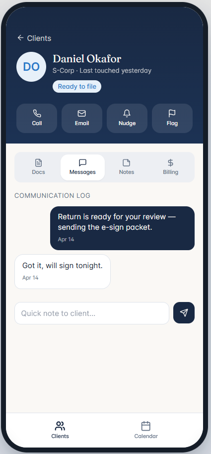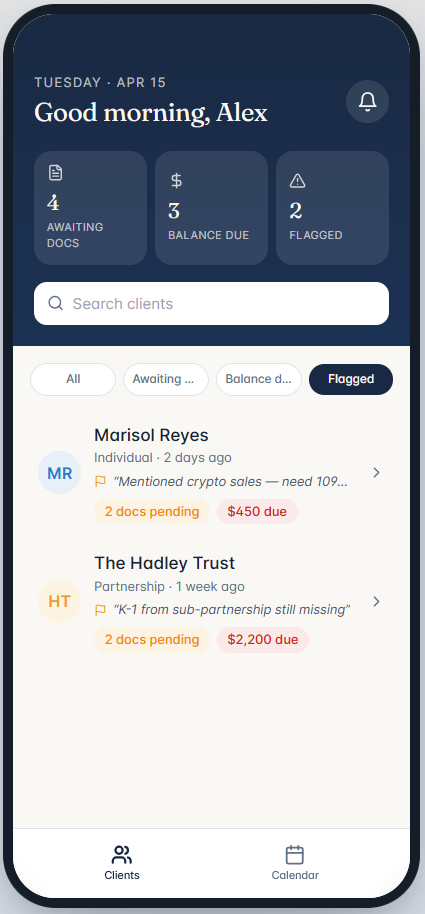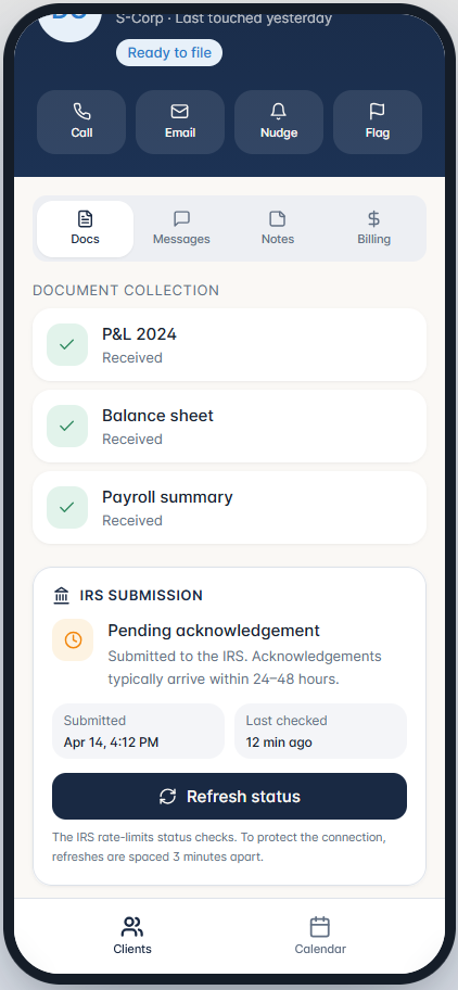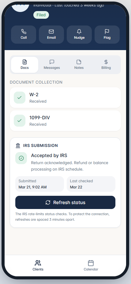 The more useful question was: what do tax professionals actually need to do when they are away from their desks? The answer had nothing to do with returns. It was about the logistics and relationships that surround the work. Chasing a client for a missing document. Checking whether a submitted return has been acknowledged by the IRS. Remembering why a particular client was flagged last week. That is the work that happens in the gaps, and we had no good tool for this work.